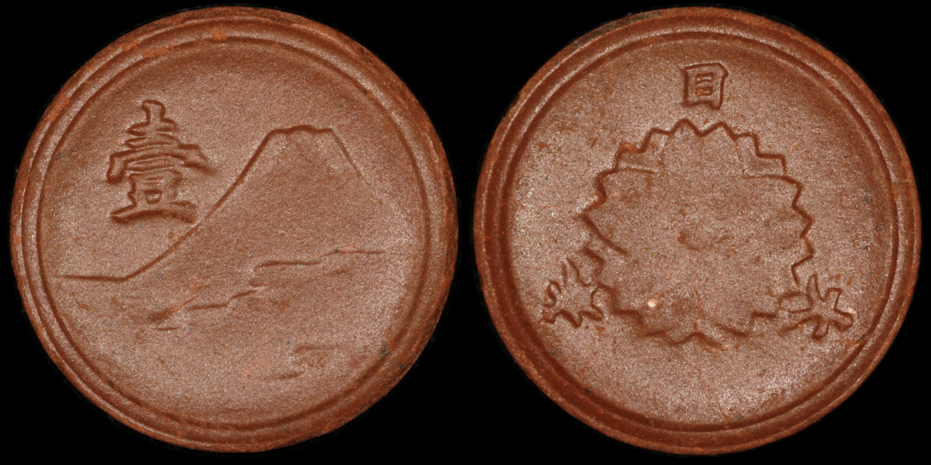 Монеты диаметром 15 миллиметров украшены изображением горы Фудзи с одной стороны и цветущей сакуры с другой. Их производство началось в условиях тотального дефицита металла, который был необходим для военной промышленности, и было сосредоточено в регионах с развитой керамической индустрией: Киото, Сэто (префектура Айти) и Арита (префектура Сага). В общей сложности было произведено около 15 миллионов таких монет, однако большинство из них после войны было уничтожено.